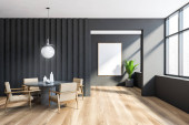 Wnętrze biura, sale imprezowe, szare ściany, drewniane podłogi, panoramiczne okna, drewniany stół z krzesłami biały i szary regały. renderowania 3D