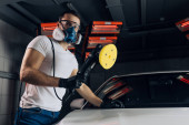 młody doświadczony człowiek omproves estetyczny wygląd samochodu