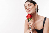 Piękno portret atrakcyjna zmysłowy zdrowych kobieta stojąc na białym tle nad białym tle pozowanie z kwiatem