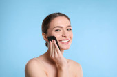 Piękno portret atrakcyjną kobietę zdrowe stojąc na białym tle nad białym tle, przy użyciu powder puff