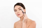 Piękno portret atrakcyjne kobiety topless, usuwając makijaż na białym tle nad białym tle wacikiem