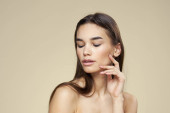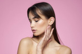 Piękno portret atrakcyjna kobieta zdrowa stojąc na białym tle nad białym tle, stosując balsam na jej ramieniu
