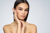 Piękno portret atrakcyjna zdrowa kobieta stojąc na białym tle nad białym tle, stanowiące