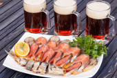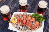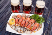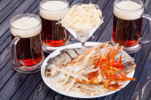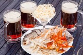 przekąski do piwa z żółtego sera, chechel, cebuli i bochenków chleba piwo na stole