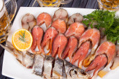 przekąska dla piwa z suszone ryby, żółtego sera, wędzonego sera cebuli i loafs piwo na stole do wykorzystania w projektowaniu