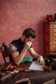 przystojny mężczyzna koncentruje się na cięcia tkaniny na buty