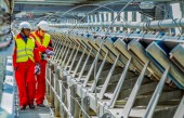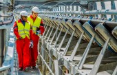 Rustenburg, Republika Południowej Afryki, 15 października 2012 r., taśma transportująca rudę pallad Platinum do przetwarzania z inspektorami bezpieczeństwa górniczego sprawdzającymi uszkodzenia