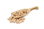 Stos i drewniana Miarka z ciecierzycy patrząc ukośnie, z przodu i na białym tle