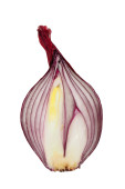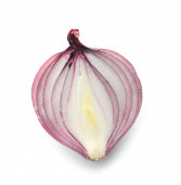 Cebula czerwony na białym tle. Przeciąć na pół. Obcinanie sposób. Ścieżki przycinające.