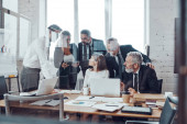 Korporacyjny międzyrasowy zespół biznesowy z wesołym liderem na spotkaniu, zbliżenie