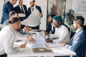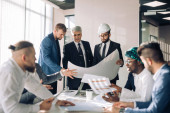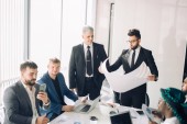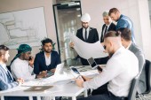 Wielorasowa grupa konstruktorów i architektów omawiająca projekt w biurze.