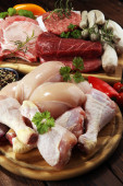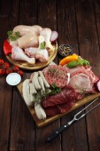 surowe mięso. Różne rodzaje surowy wieprzowina, kurczak i wołowina z przypraw i ziół i kiełbaski