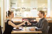 Młoda para szczęśliwy na romantyczną randkę picie kieliszek czerwonego wina w restauracji