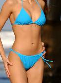 Śliczne Latina długie włosy brunetka kalendarz czerwony dziewczyna bikini z głębokim rozcięciu na piasku kamień morze na plaży ciepła woda piany fale morskie złoto złote oświetlenie z błękitne niebo słoneczny dzień kopia tło i tekst w obszarze kwadratowym dla kalendarza