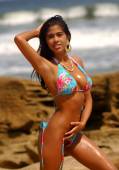 Śliczne Latina długie włosy brunetka kalendarz dziewczyna czerwony bikini z głębokim rozbieranie się na piasku na plaży, morze, woda z błękitnym piaskiem, słońce, światło słoneczne, niebieski niebo, słoneczny, tło