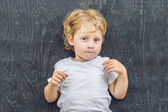Dziecko, siedząc na podłodze z jego dom wygląda przystojny, a on tylko grzebienie jego włosy, pojęcie niezależne i autonomiczne dziecko.