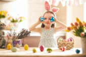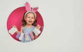 Słodkie małe dziecko sobie uszy królika na Wielkanoc. Dziewczyna z pisanki na tle różowy i biały.