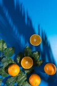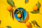 Owoce cytrusowe na talerzu na tle niebieski i żółty