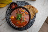 Zdjęcie "Kharcho tradycyjne gruzińskie kuchnia zupa z mięsem, ryżem i świeżej kolendry na podłoże drewniane. Podawane z tasts." może być wykorzystywane do celów osobistych i komercyjnych zgodnie z warunkami zakupionej licencji Royalty-free. Obraz jest dostępny do pobrania w jakości wysokiej rozdzielczości do 5760x3840.