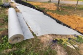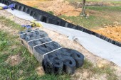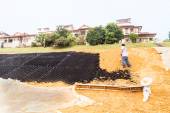 Zbliżenie na stoku erozji kontroli materiały z siatki, arkusze i ziemi na stromym zboczu do zarządzania osuwisko
