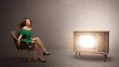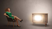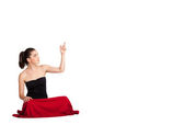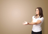 Piękna młoda kobieta prezentująca nowoczesną przestrzeń do kopiowania