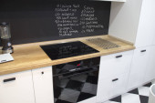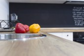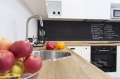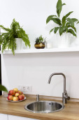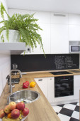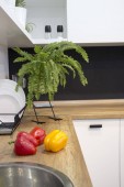 Nowoczesne biały kształt u kuchnia w stylu skandynawskim. Otwarte półki w kuchni z roślin i słoiki. Wiosenne dekoracje
