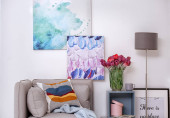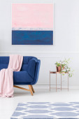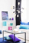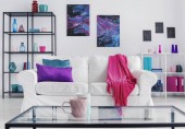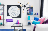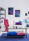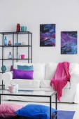 Purpurowe, niebieskie i zielone poduszki i różowy koc na białej kanapie w stylowym salonie z grafiką galaktyki na ścianie