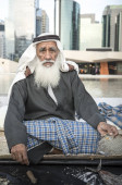 Emiraty człowieka stojącego na brzegu rzeki w starej części Al Seef z Dubai, Zjednoczone Emiraty Arabskie