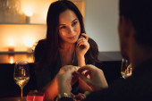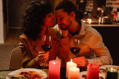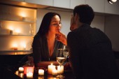 Zdjęcie "Piękna para namiętny o kolacji przy świecach w domu, picia wina, opiekania, Całowanie" może być wykorzystywane do celów osobistych i komercyjnych zgodnie z warunkami zakupionej licencji Royalty-free. Obraz jest dostępny do pobrania w jakości wysokiej rozdzielczości do 5760x3840.