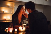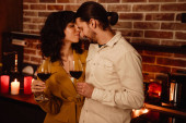 Piękna para namiętny o kolacji przy świecach w domu, picia wina, opiekania, Całowanie