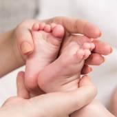 Stopy dziecka cupped ręce matki. Delikatne tło niewyraźne nogi i pięty noworodka