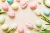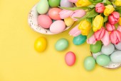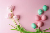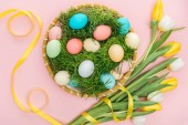 Widok z góry kwiatów tulipanów i pastelowych pisanki na różowym tle