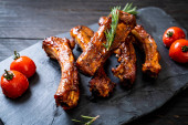 Zdjęcie "grillowane żeberka wieprzowe z rozmarynem i pomidorami" może być wykorzystywane do celów osobistych i komercyjnych zgodnie z warunkami zakupionej licencji Royalty-free. Obraz jest dostępny do pobrania w jakości wysokiej rozdzielczości do 5760x3840.