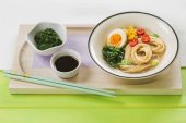 Azjatyckiej zupy z makaronem, ramen z wieprzowiny, warzywami i jajkiem w misce. Widok z góry.