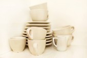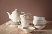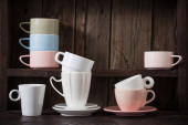 Różnych filiżanki ze spodeczkami na drewnianym stole