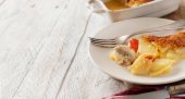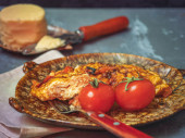 Pożywne śniadanie klopsiki i smażone ziemniaki, pokroić na duże kawałki, herbata w kubek szary aluminium na sztućce obok płyty. Całość kompozycji jest na stole stary Zarząd.