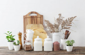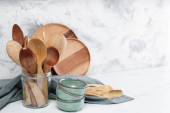 Zestaw przyborów kuchennych z kaszy na stole w pobliżu biała ściana