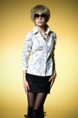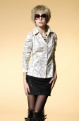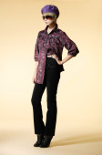 stroju wiosna, portret współczesnej kobiety Blondynka młodych w fioletowy liliowy pantsuit i buty z obcasami, strzał na białym tle