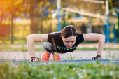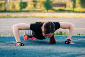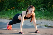 Młoda kobieta siłowni w parku. Fitness w przyrodzie. Gimnastyka poranna