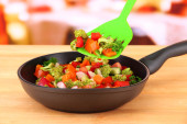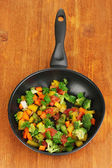 ragout warzyw na patelni, na drewnianym stole na jasnym tle