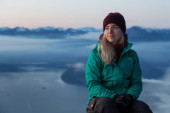 Dziewczynka kaukaski śnieżnych jest na szczycie góry podczas zimowych wibrujący zachód słońca. Podjęte na szczycie Zoa szczyt w pobliżu nadziei, British Columbia, Kanada.