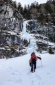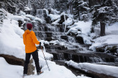 Zdjęcie "Wędrówki na rakietach śnieżnych w śniegu w dzień biały zima. Podjęte na pieszą wycieczkę do Alexander Falls, w pobliżu Whistler i Squamish, północ od Vancouver, Bc, Kanada." może być wykorzystywane do celów osobistych i komercyjnych zgodnie z warunkami zakupionej licencji Royalty-free. Obraz jest dostępny do pobrania w jakości wysokiej rozdzielczości do 5760x3840.