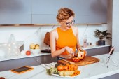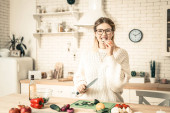 Ładny dobry patrząc kobieta krojenia warzyw na sałatkę