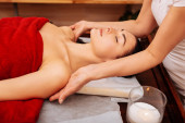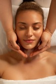 Atrakcyjna kobieta Ciemnowłosa odpoczynek z zamkniętymi oczami w trakcie procedury
