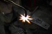 Zbliżenie nierozpoznawalnego Kowalskiego mielenia podgrzewanego detalu utrzymywanych przez Szczypce na przestrzeni roboczej w fabryce