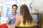 Ładny dorywczo dziewczynka z napój do jej przyjaciel, co może zrobić po zakupy
