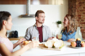 Młody żonaty kaukaski para siedzi przy stole w przytulnej kuchni, picie kawy, jedzenie śniadanie i mówić o planach na weekend
