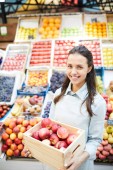 Wesoła podekscytowany młoda kobieta sprzedawca spożywczy w fartuch stoi przed straganie żywności i trzymając pudełko z jabłek, ona sprzedaży świeżych owoców i warzyw