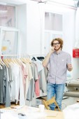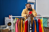 Afrykański uśmiechnięty stylista stojący w pobliżu szafy i wybierając ubrania