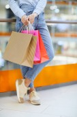Atrakcyjna dziewczyna w dorywczo różowa skórzana kurtka patrząc na Ciebie po zakupy w centrum handlowym